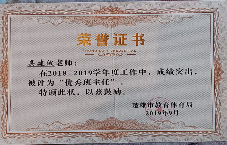 在担任年级主任的二十年间,吴建波老师勇挑重担,统筹协调,带领年级团队屡创佳绩,所带年级在楚雄州教育体育局评比中先后获得二等奖两次、三等奖一次,为学校的发展作出了重要贡献。