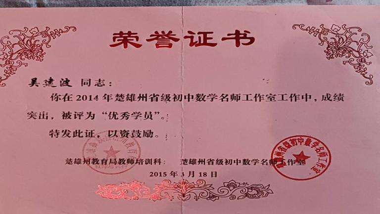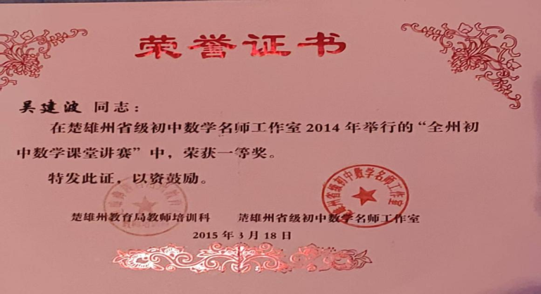 在十六年的教研组长、十二年的备课组长工作中,吴建波老师深耕教学研究,不断淬炼专业能力,带领团队积极探索课堂改革,取得累累硕果。2014年,他在楚雄州名师工作室课程教学竞赛中荣获一等奖,展现了卓越的教学风采。