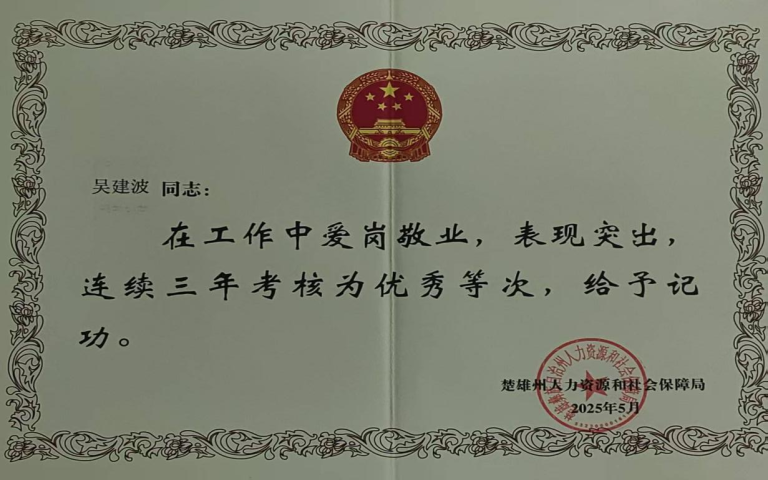 从教以来,吴建波老师多次被评为优秀教师、优秀班主任、优秀教研组长、优秀年级主任。2022年,他荣获楚雄市委市人民政府表彰的“优秀班主任”称号;2025年,荣获楚雄州人力资源和社会保障局记功表彰。荣誉背后,是他多年如一日的坚守与付出。