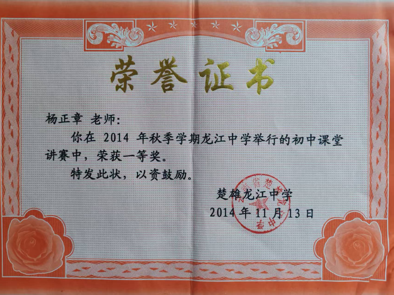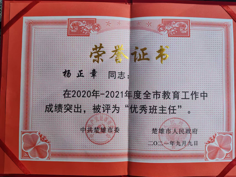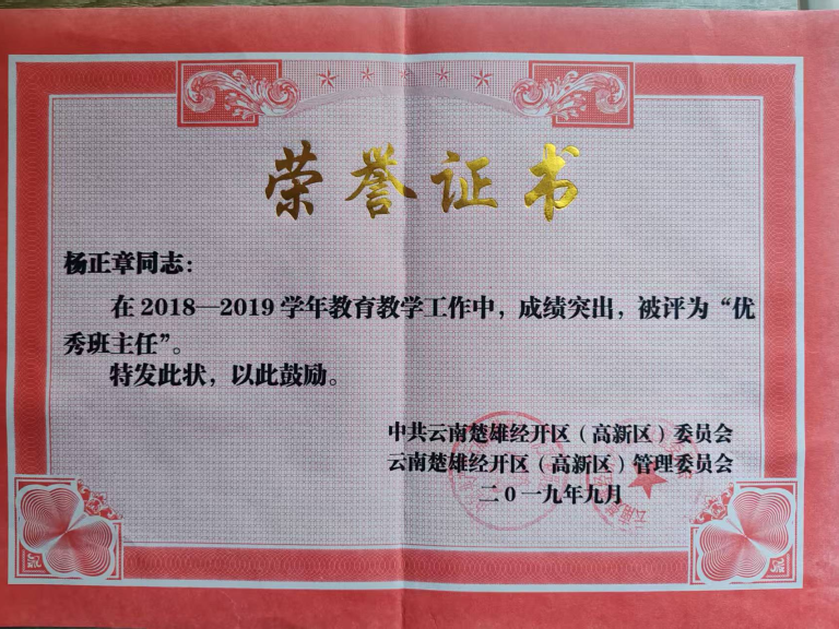 在班级管理方面,杨正章老师连续多年担任班主任、年级主任工作,经验丰富,成效显著。积极参与专业能力和管理能力提升,包括省级道德与法治青年教师培训计划、楚雄州名班主任赴上海嘉定区跟岗培训等,现为省级(班主任)名师工作室学员,多次获评校级、镇级、市级“优秀班主任”称号。
