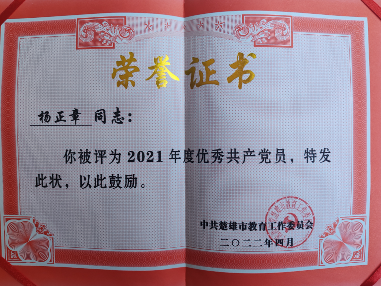 作为党员教师,杨正章老师思想政治素质过硬,先锋作用明显。2021年被评为市级“优秀共产党员”,展现了坚定的理想信念和较高的党性修养,在工作中发挥了党员的先锋模范作用。