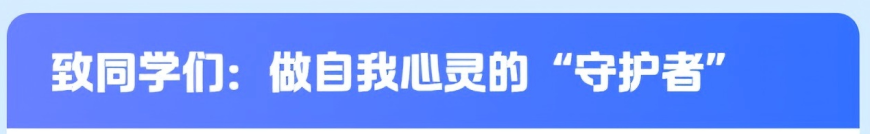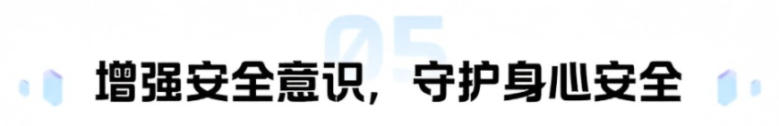 心理健康与生理安全息息相关。假期出行遵守交通规则,远离危险场所;注意网络安全,不沉迷虚拟世界、不随意透露个人信息、不参与不良网络社交;敬畏生命,树立积极的生命观,明白每一个生命都有独特价值,无论遭遇何种困境,都有无数人在守护着自己。