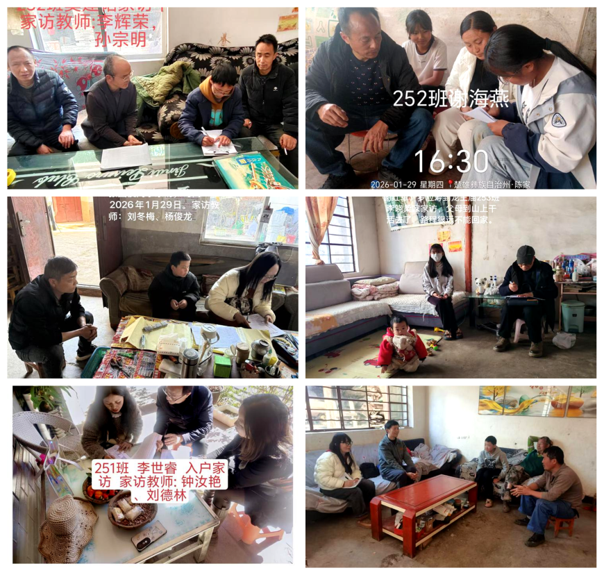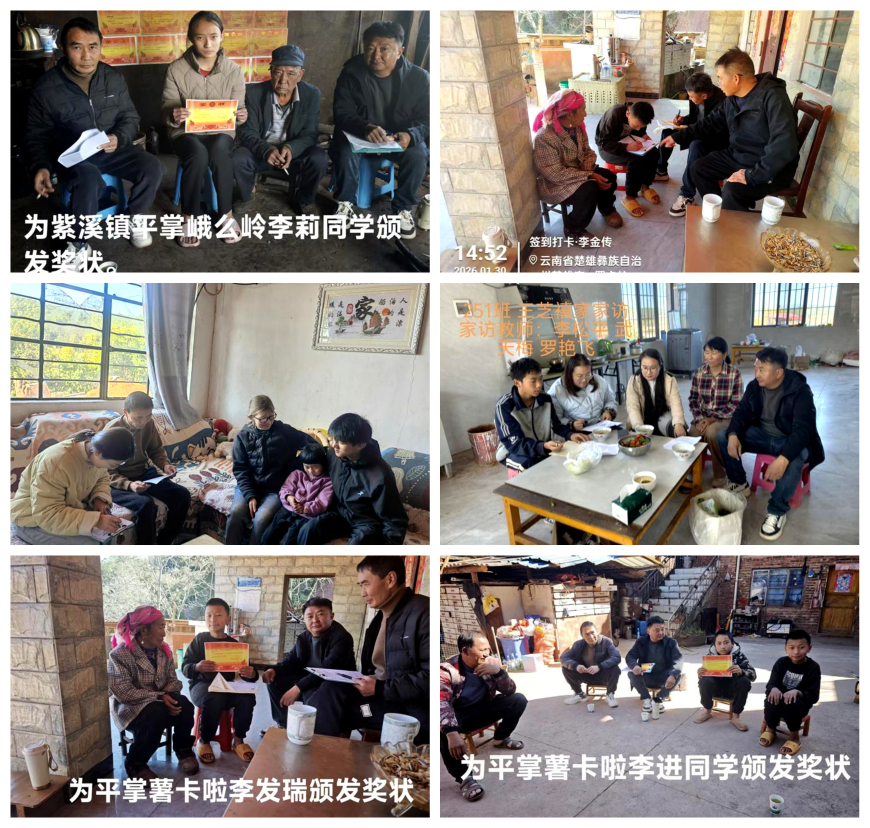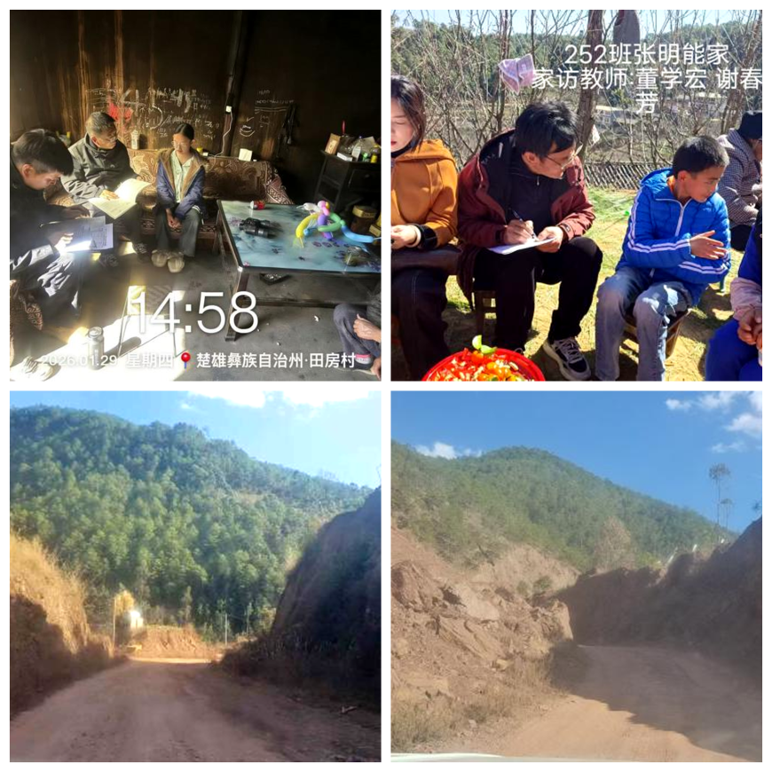 为深入贯彻 “立德树人” 根本任务,扎实推进“双百”家访工作。1月28日至29日,龙江中学在寒假刚开始就组织21名七年级教师奔赴楚雄市紫溪镇开展 “全覆盖、深沟通、实帮扶”家访活动。此次家访覆盖紫溪镇2个社区、6个村委会的75户七年级学生家庭,涵盖坝区、半山区及高寒山区,涉及汉、彝、苗等多个民族。在面对面交流中摸清学生成长底数,在精准对接中凝聚教育共识,为七年级学生平稳度过初中适应期筑牢家校共育桥梁。