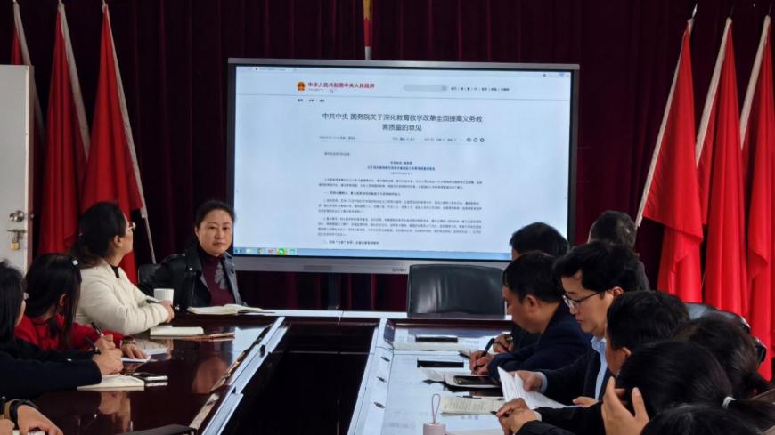会上,大家共同研读《中共中央国务院关于深化教育教学改革全面提高义务教育质量的意见》,围绕文件中立德树人根本任务、课堂教学改革等核心内容进行系统阐释,结合我校办学实际,明确三项重点工作:优化课堂教学模式,打造高效课堂;强化教师队伍建设,提升专业素养;聚焦学生全面发展,落实立德树人根本任务。