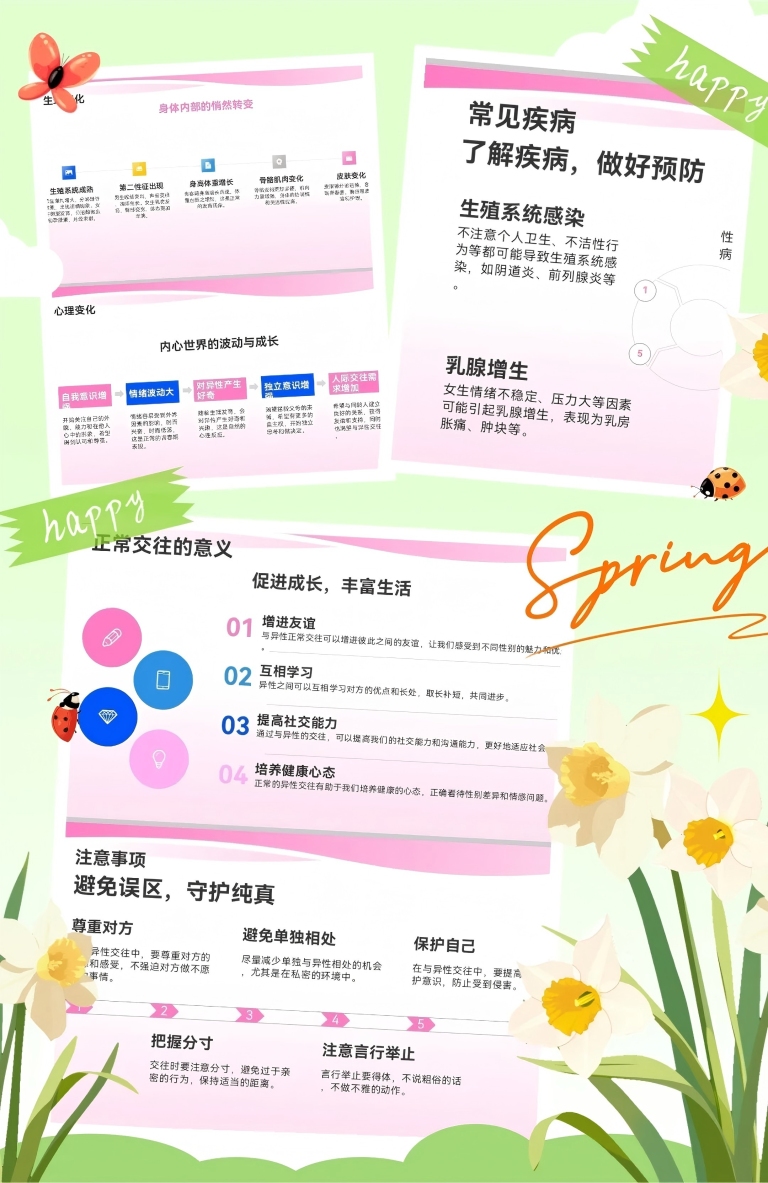 讲座内容层层递进,贴合女生青春成长需求:首先从青春期身体发育切入,用通俗的语言科普生理变化的特点与规律,帮助同学们科学认识自身成长,学会以坦然心态健康拥抱青春期;接着,老师结合学生身边真实事例,生动讲解异性交往的原则与尺度,引导大家树立健康的交往观念,在尊重与理解中建立良性同伴关系;随后,又从科学专业的角度,系统讲解女性健康知识,细致介绍常见健康问题的识别方法与预防要点,帮助同学们提升自我健康管理意识;最后,老师以“理性对待成长,守护身心健康”为核心总结,为整场讲座画上温暖而有力量的句号,让知识与关怀深深印在同学们心中。