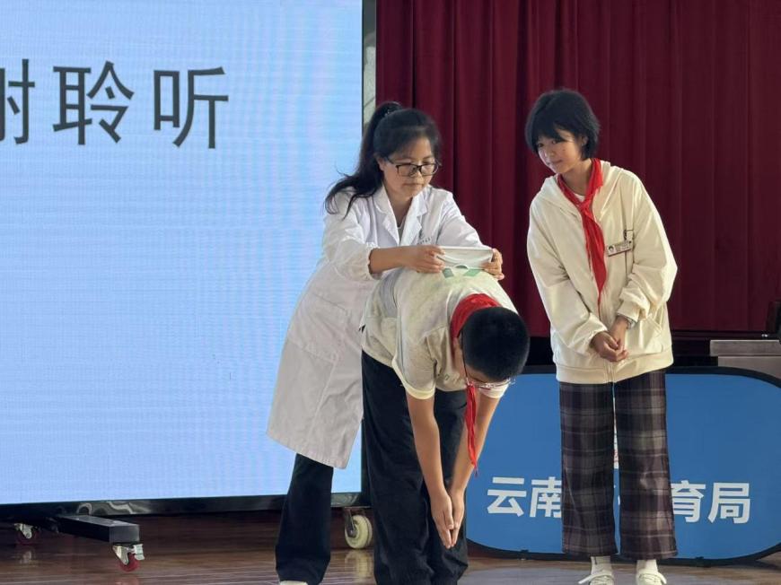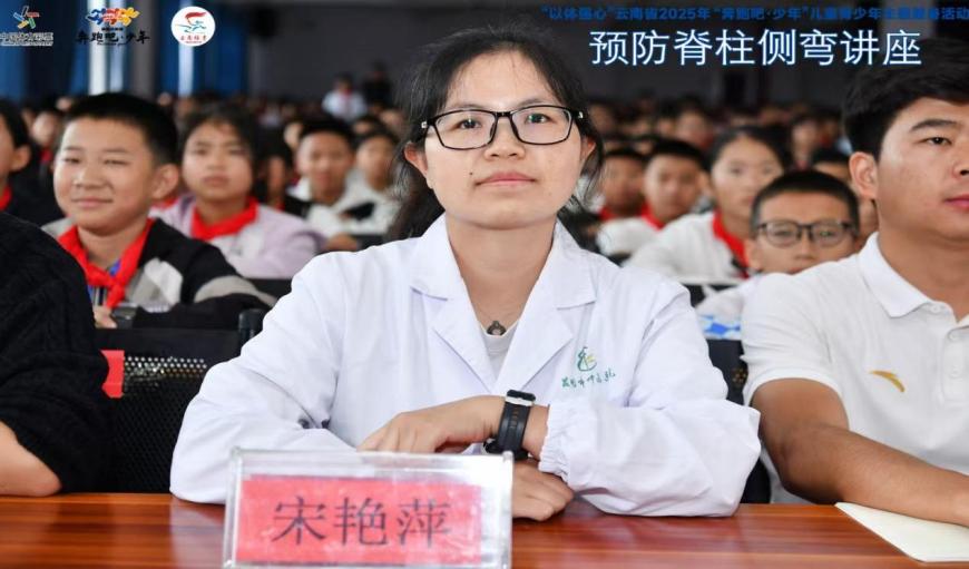 本次活动的核心环节,是特邀专家——昆明市中医医院主管治疗师宋艳萍带来的脊柱侧弯预防科普讲座。宋医生凭借其丰富的临床与教学经验,用生动易懂的语言,为同学们系统讲解了脊柱侧弯的成因、危害与早期识别方法,并传授了日常学习生活中的科学防护知识,纠正了误区。