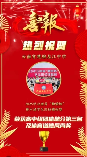 热烈祝贺龙江中学在云南省“勤锻炼”第六届学生田径锦标赛中大放异彩!全省200余所学校同台竞技,我校勇夺高中组团体总分第三名,获评“体育道德风尚奖”。接力赛场亮点十足:男子4×400